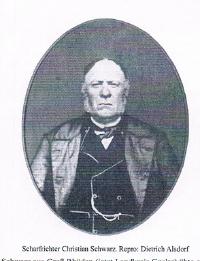 Johann Christian Schwarz römisch katholisch. Er hatte den Beruf ein unbekanntes Datum einem unbekannten Ort ; Scharfrichter, Abdecker, Pferdeschlachter. Er ist geboren am 18 Mai 1793 in Seesen. Er war Zeuge des Sterbedatum von Heinrich Wilhelm Reinhard Stock am 9 Juni 1854 in Rie3nsförde, Stade; Enthauptung durch den Scharfrichter Christian Schwarz wegen Raubmord und Raub vor tausenden Menschen um 7:30 Uhr. Er stirbt an am 13 Februar 1867 in Groß Rhüden im Alter von 73. Er wird begraben circa 16 Februar 1867 in Bilderlahe.